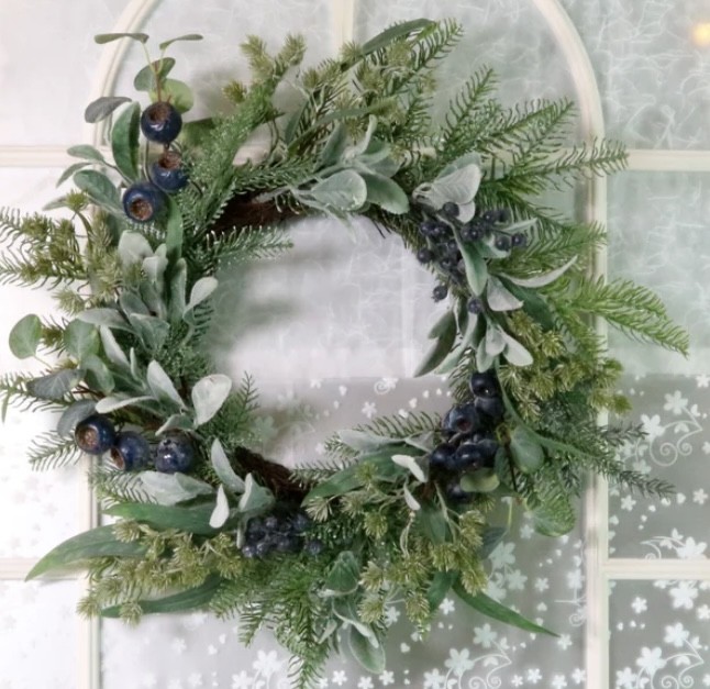 A faux wreath of mixed winter foliage decorated with blue winter berries approx 16″-18″ dia