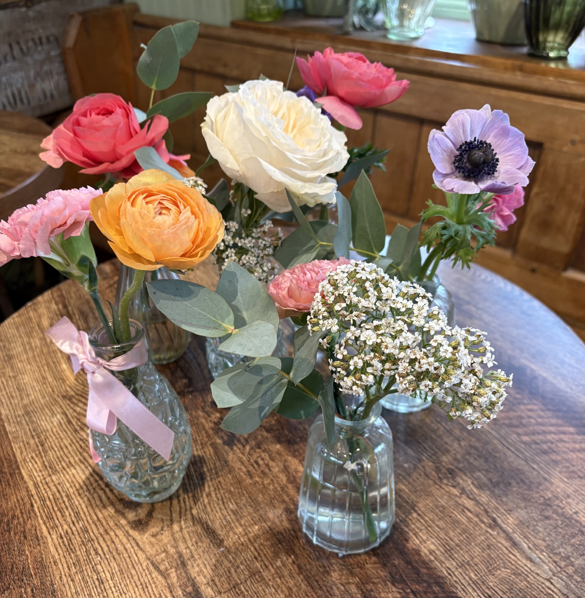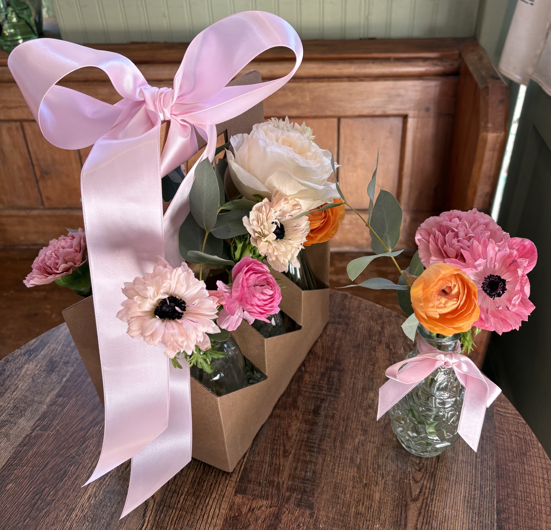 A collection of six clear glass bud vases each filled with spring flowers & foliage and presented in a natural kraft bottle carrier finished with satin ribbon