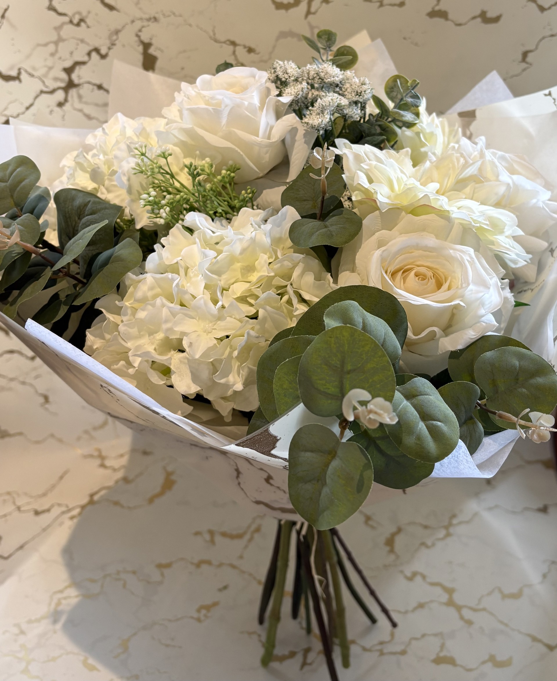 A beautiful bouquet of dry-touch, artificial blooms & foliage, hand-tied and gift-wrapped in luxurious tissue & cellophane